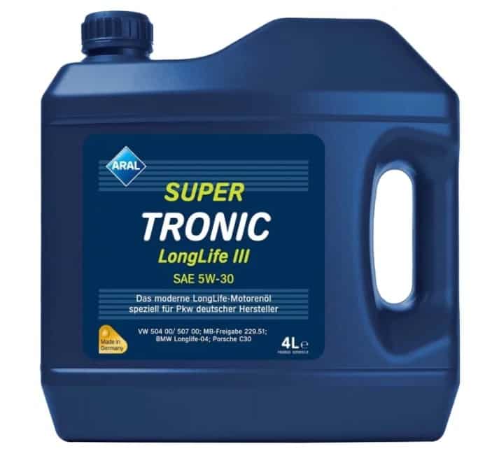 Масло Aral Super Tronic Longlife III 5w30 – 4 литра е 100 % синтетично моторно масло, което е предназначено за бензинови и дизелови двигатели с и без турбокомпресор, както и за автомобили с DPF филтър за твърди частици. То е подходящо за двигатели на VW/Audi с LongLife Service, и специално за R5- и V10 TDI във Phaeton и Touareg.