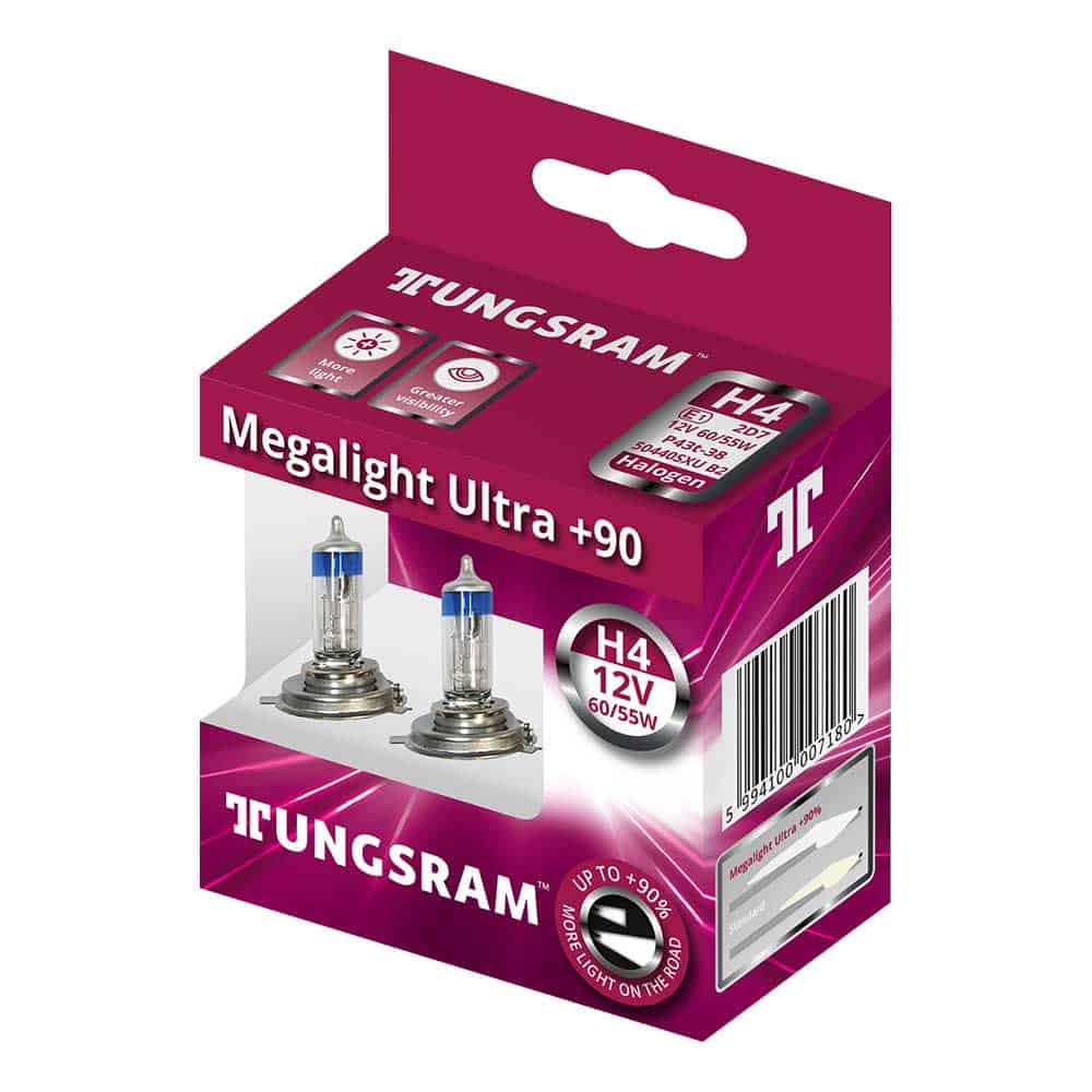 Tungsram Megalight Ultra – премиум лампи имат допълнителни предимства по отношение на живот, цвят, устойчивост на вибрации или мощност и притежават повишена яркост Tungsram Megalight Ultra осигуряват голям скок в пътната безопасност, в сравнение с обикновените халогенни лампи, поради огромното увеличение на осветеното зрително поле.