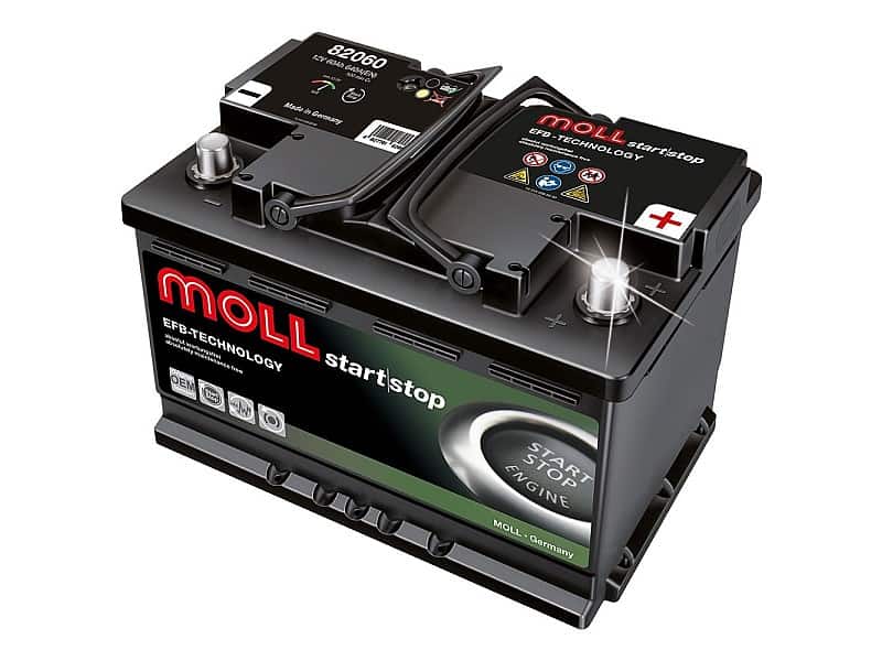 Акумулатор MOLL EFB Start/Stop 12V 64AH 620A R+ е предназначена както за автомобили със start-stop система, така и за заместител на стандартна стартерна батерия. Това е батерия с тройно увеличен цикличен живот, спрямо конвеционалните батерии. Изключително подходяща за превозни средства с предимно градски цикъл на употреба и/или с повече консуматори и автомобили със система за рекуперация, микро хибриди.