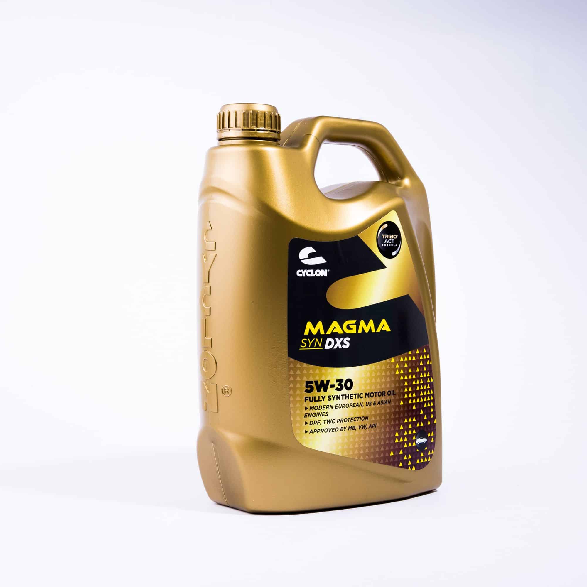 Двигателно масло CYCLON MAGMA SYN DXS 5W30 4L e напълно синтетично моторно масло с TriboACT Formula, базирана на иновативна система за добавки, която поради различния поляритет на нейните компоненти, активира силни химически взаимодействия, като по този начин повишава в най-висока степен защитата, която маслото дава на двигателя.