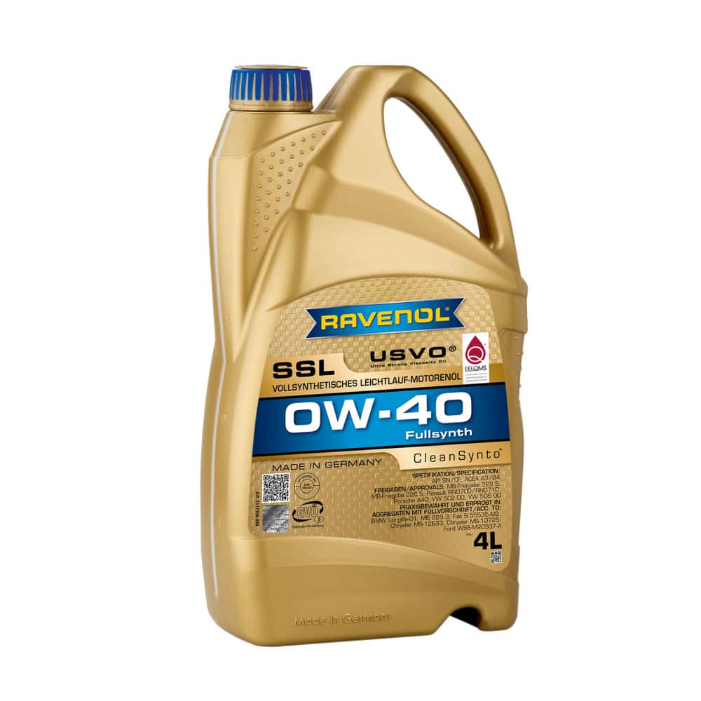 Масло RAVENOL Super Synthetik Ol SSL 0W40 4L e напълно синтетично моторно масло, с нисък коефициент на триене, произведено на основата на PAO (Polyalphaolefin) и технологгите USVO® и CleanSynto®. За бензинови и дизелови двигатели на леки и лекотоварни автомобили с и без турбо зареждане и директно впръскване.