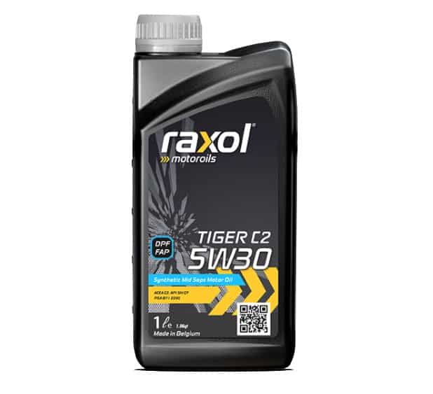 Масло RAXOL TIGER C2 5W30 1L е Напълно синтетичен „Mid Saps“ мотор от последно поколение, за смазване на всички бензинови и дизелови двигатели, оборудвани с устройства за последваща обработка (DPF). Съставът на маслото с ниска пепел предпазва двигателя и катализаторната система. Подобрена икономия на гориво.