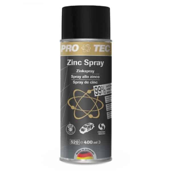 Спрей Pro-Tec Zinc Spray – 400ml e бързо съхнещ, термоустойчив, с дълготрайно действие против корозия. Продуктът се състои от 99 % чиста цинкова боя и осигурява надеждна защита на продупчени, разрязани или режещи повърхности. Може да бъде използван и за допълнителна защита на машинни съоръжения, които постоянно са изложени на въздействието на времето. Върху цинковото покритие може да се боядисва.